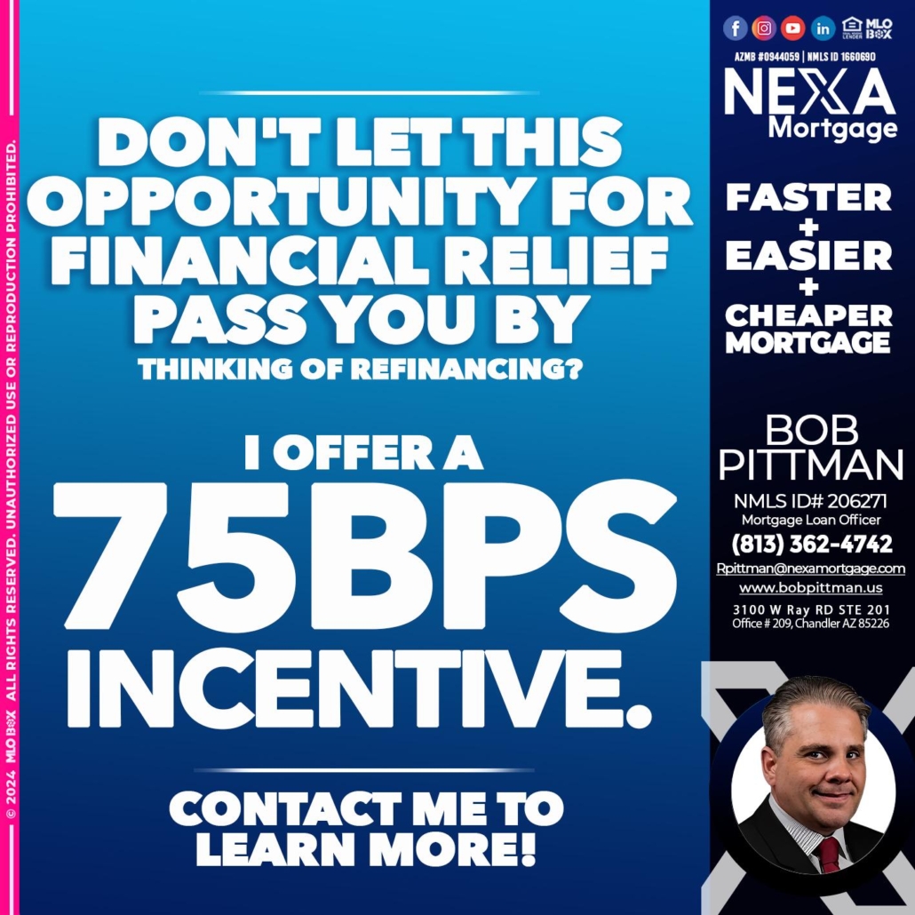 Hi, my name is Bob Pittman. I’m a Loan Officer with NEXA Mortgage LLC., offering personalized mortgage solutions, fast customized quotes, great rates and service with integrity.