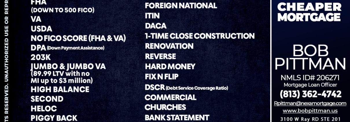 Hi, my name is Bob Pittman. I’m a Loan Officer with NEXA Mortgage LLC., offering personalized mortgage solutions, fast customized quotes, great rates and service with integrity.