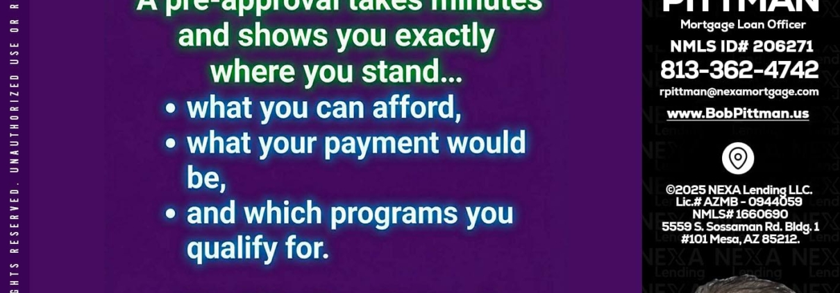 Hi, my name is Bob Pittman. I’m a Loan Officer with NEXA Lending LLC., offering personalized mortgage solutions, fast customized quotes, great rates and service with integrity.