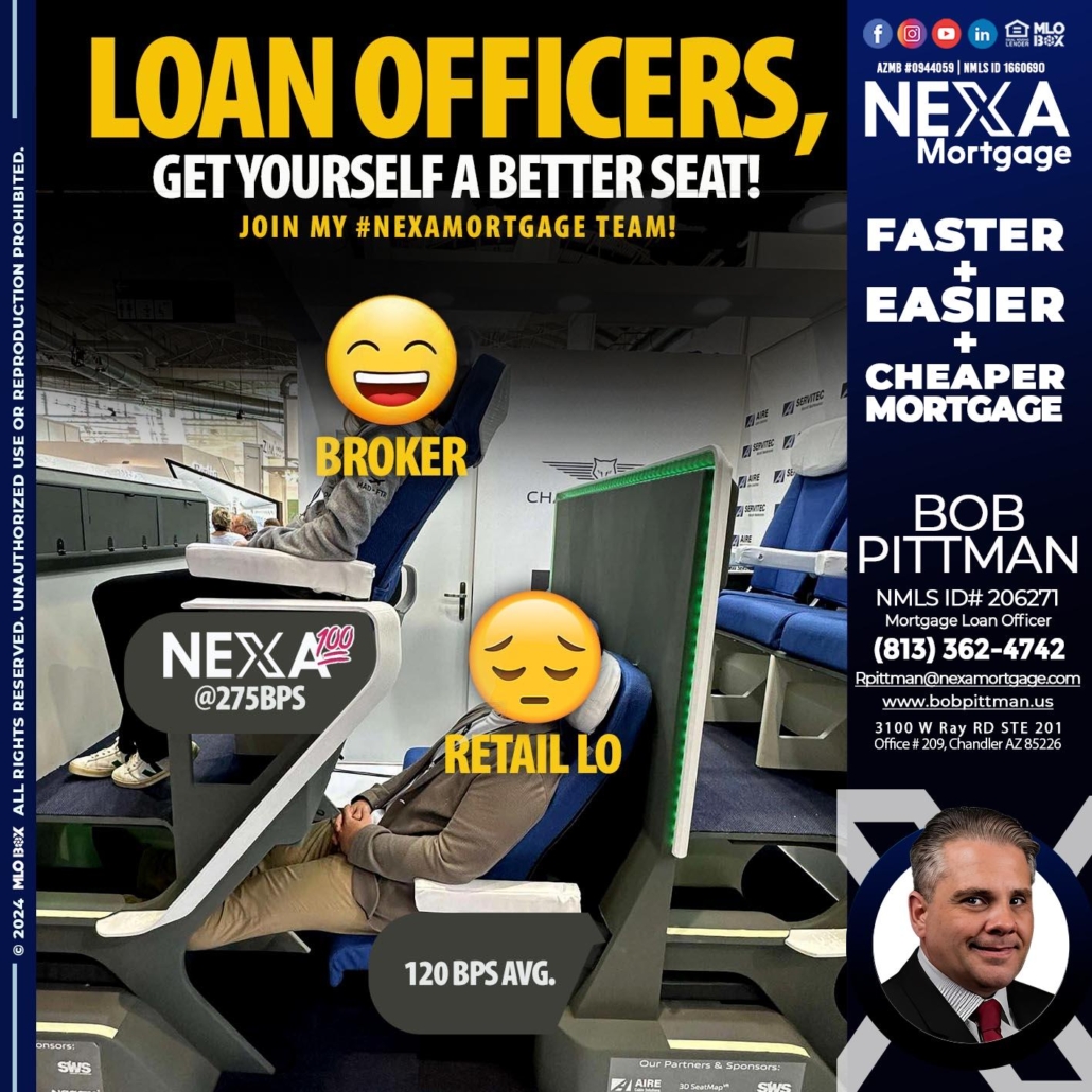 Hi, my name is Bob Pittman. I’m a Loan Officer with NEXA Mortgage LLC., offering personalized mortgage solutions, fast customized quotes, great rates and service with integrity.