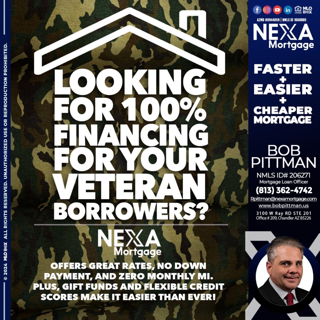LOOKING 100% - Bob Pittman -Mortgage Loan OfficerHi, my name is Bob Pittman. I’m a Loan Officer with NEXA Mortgage LLC., offering personalized mortgage solutions, fast customized quotes, great rates and service with integrity.