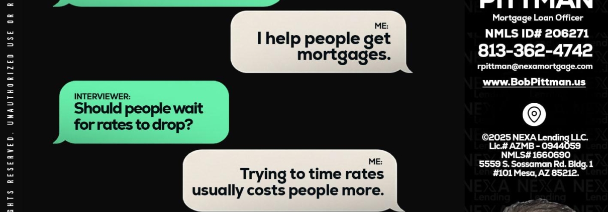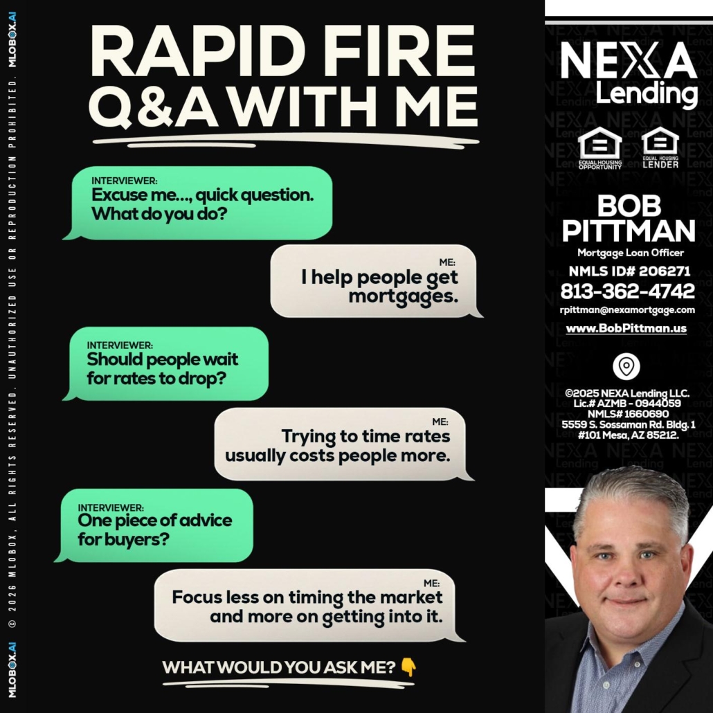 rapid fire - Bob Pittman -Mortgage Loan OfficerHi, my name is Bob Pittman. I’m a Loan Officer with NEXA Lending LLC., offering personalized mortgage solutions, fast customized quotes, great rates and service with integrity.